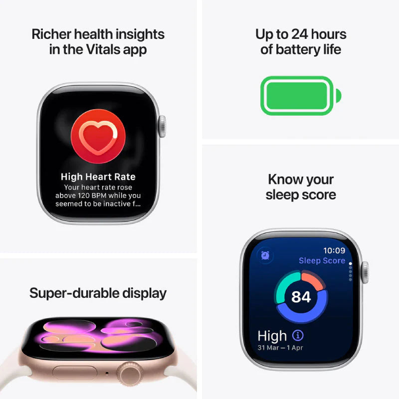 Health & Wellness Apps: Blood Oxygen, ECG, Heart Rate, Sleep (stages & score), Cycle Tracking, Medications, Mindfulness, Noise, Sleep apnea & hypertension notifications