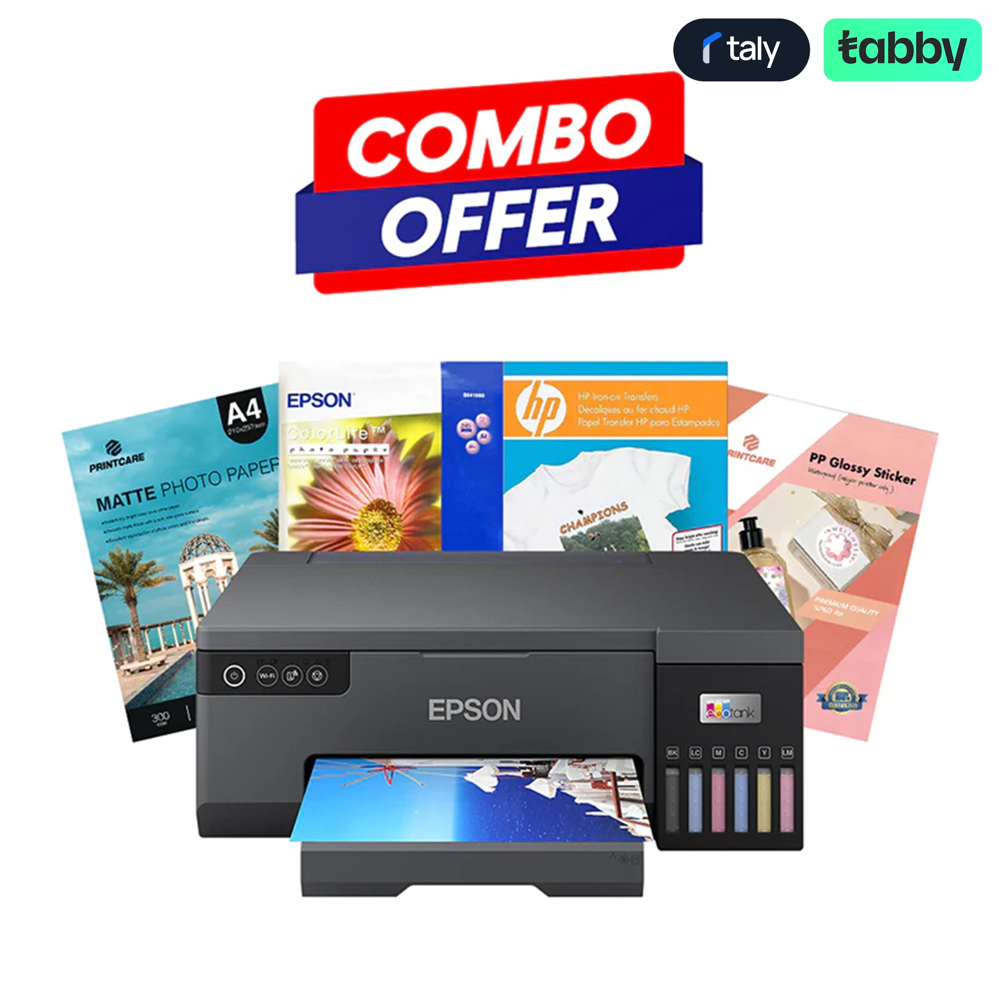 Epson L8050 Printer; HP Iron-on Transfers – A4, Light-coloured Fabrics, 12 Sheets; JoJo Self Adhesive Transparent Film – A4, 50 Sheets, Waterproof Inkjet Printing, JT-3002; Print Care Glossy Photo Paper – A4, 180GSM, 50 Sheets, Waterproof Inkjet Printing; Epson ColorLife Photo Paper – 245GSM, A4, 20 Sheets