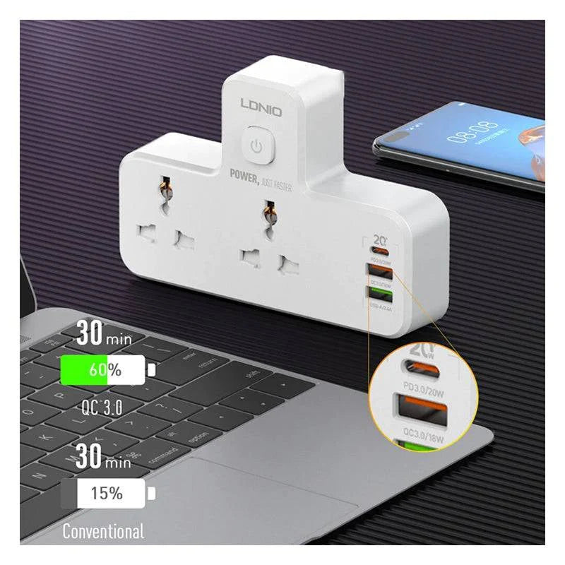 *With US/UK/EU plug. One device with 2 outlets & 4 USB ports which can charge for multiple devices simultaneously.