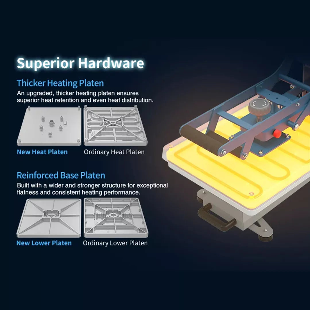 • Large Heat Platen (16" x 20") – Perfect for T-shirts, hoodies, bags, and other large-format prints.