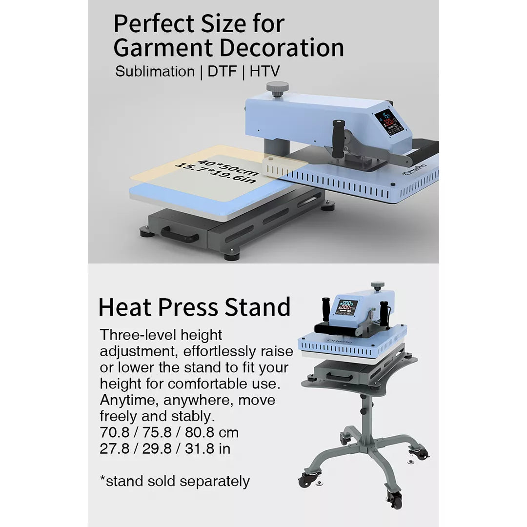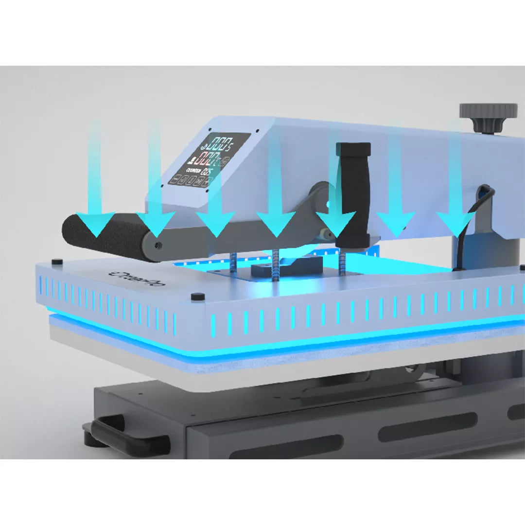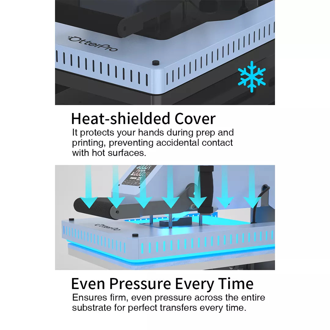 The OtterPro Swing-Away Drawer Heat Press (16" x 20" / 40 x 50 cm, Light Blue) is a premium, professional-grade heat press machine designed for safety, efficiency, and superior transfer quality. Featuring an innovative swing-away design, it allows users to easily and safely place their materials on the platen before pressing—reducing the risk of burns and enhancing workspace safety. The drawer-style lower platen provides added convenience for positioning garments and substrates with precision.
