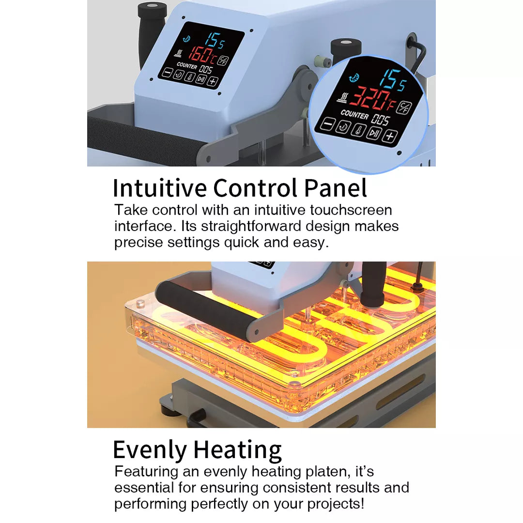 Built with a high-pressure eccentric bearing system, this machine ensures even heat and pressure distribution across the entire surface, guaranteeing consistent and high-quality transfer results. Suitable for sublimation, heat transfer vinyl (HTV), and direct-to-film (DTF) applications, it’s the perfect choice for both professionals and small business owners seeking efficiency, safety, and reliability in every press.