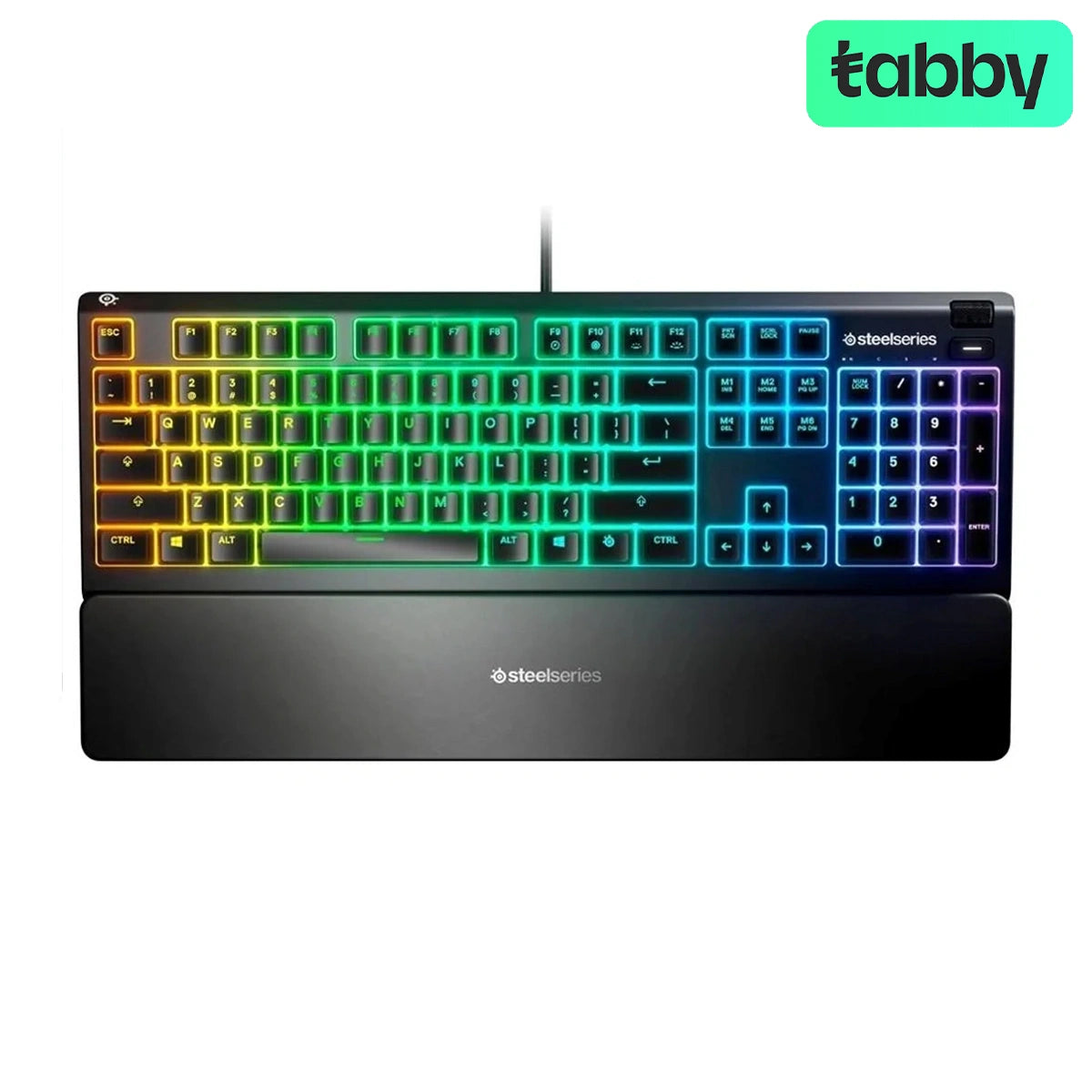 The SteelSeries Apex 3 Water Resistant Keyboard is a wired gaming keyboard built for comfort, durability, and quiet performance. It features whisper-quiet gaming switches, customizable RGB lighting zones, and a water-resistant design (IP32) that helps protect against accidental spills. The keyboard includes a magnetic wrist rest for enhanced comfort, dedicated media controls, and support for the Arabic layout.